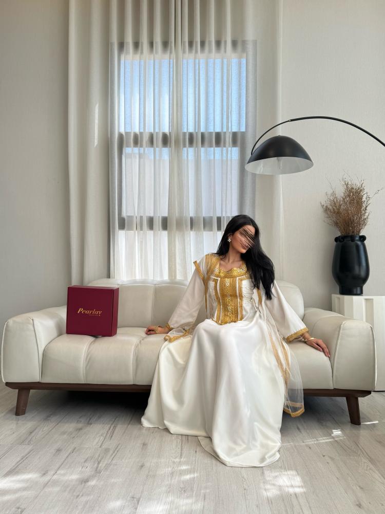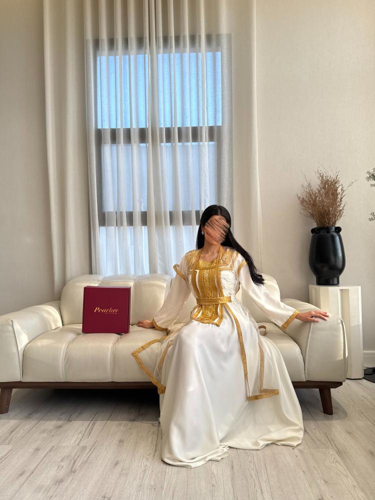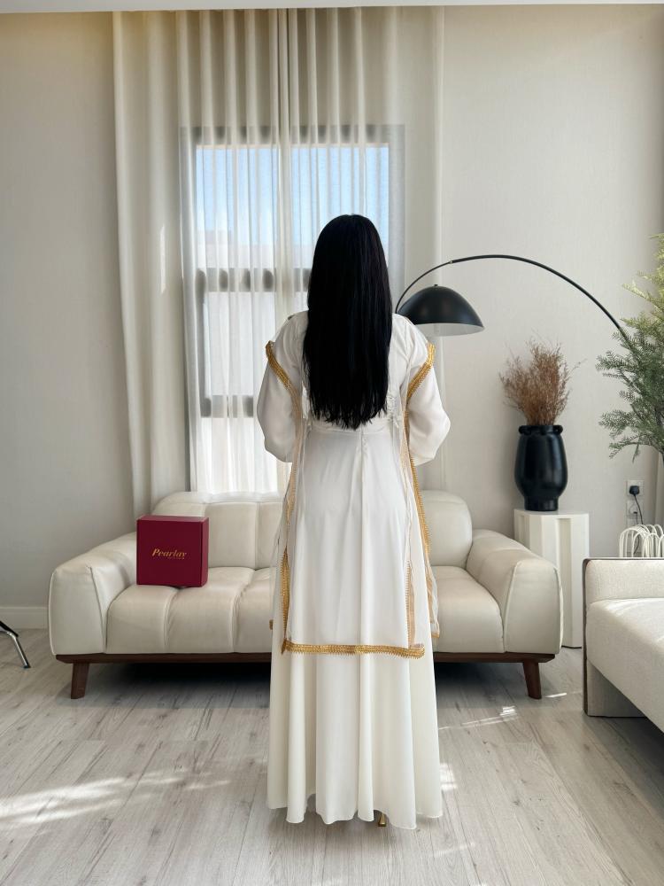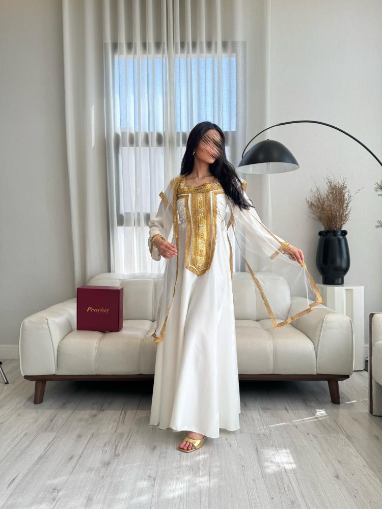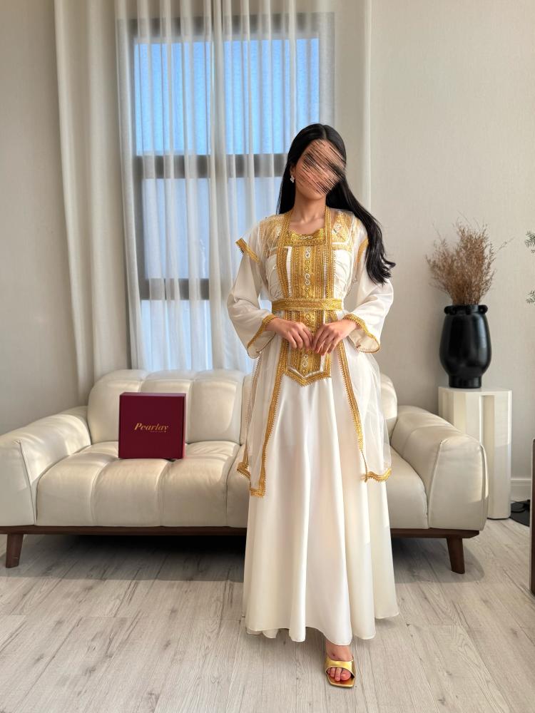 يتميز هذا الفستان الفاخر بتصميم تراثي أنيق يجمع بين الفخامة واللمسة الكلاسيكية العريقة. يأتي باللون الأبيض النقي مع تطريزات ذهبية متقنة، تعكس الفخامة والأصالة في آنٍ واحد. تفاصيل التطريز تزين الصدر والأكمام، مما يمنح الفستان طابعًا ملكيًا فريدًا.