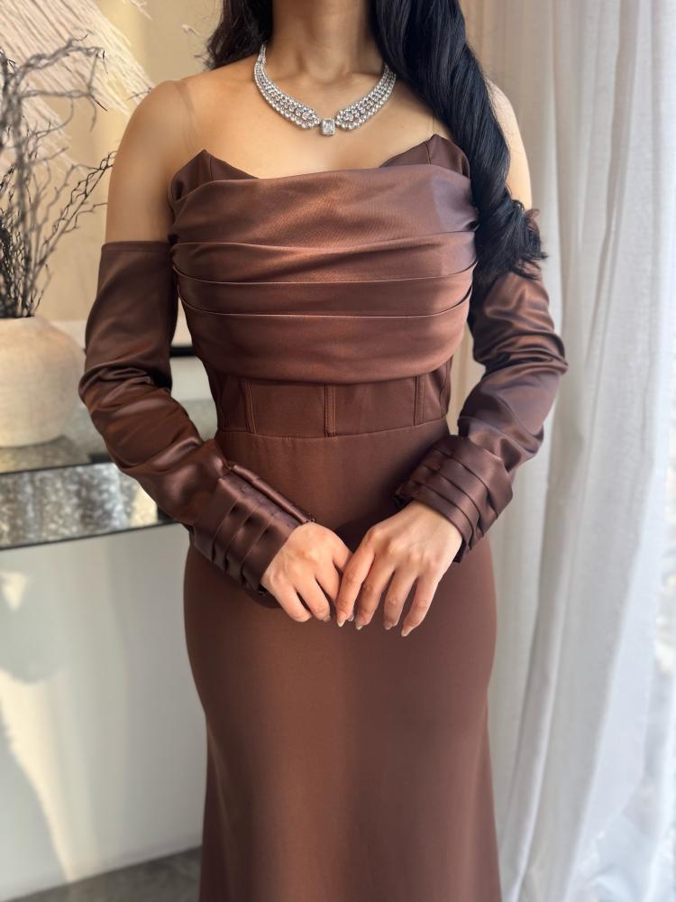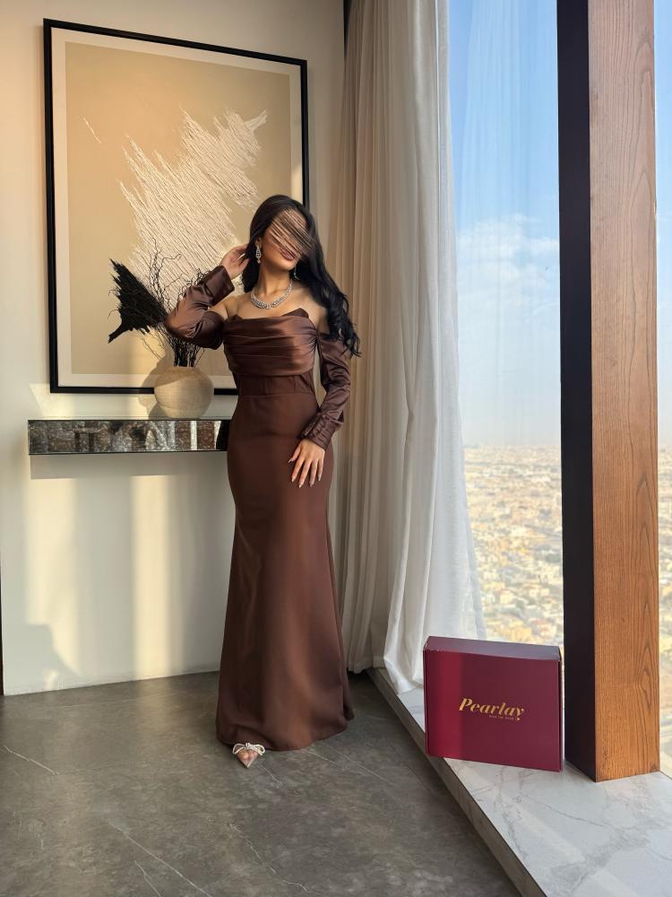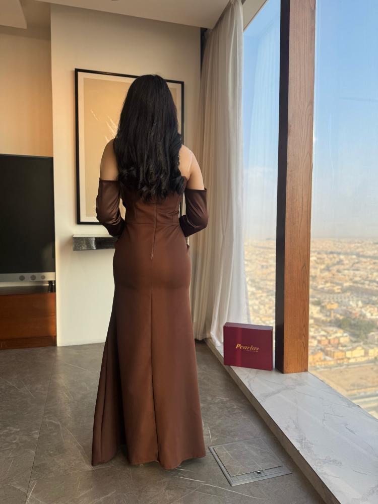 فستان أنيق ومميز بتصميم عصري يلائم المناسبات الفاخرة، مصمم بلون بني دافئ يبرز الإطلالة الراقية.