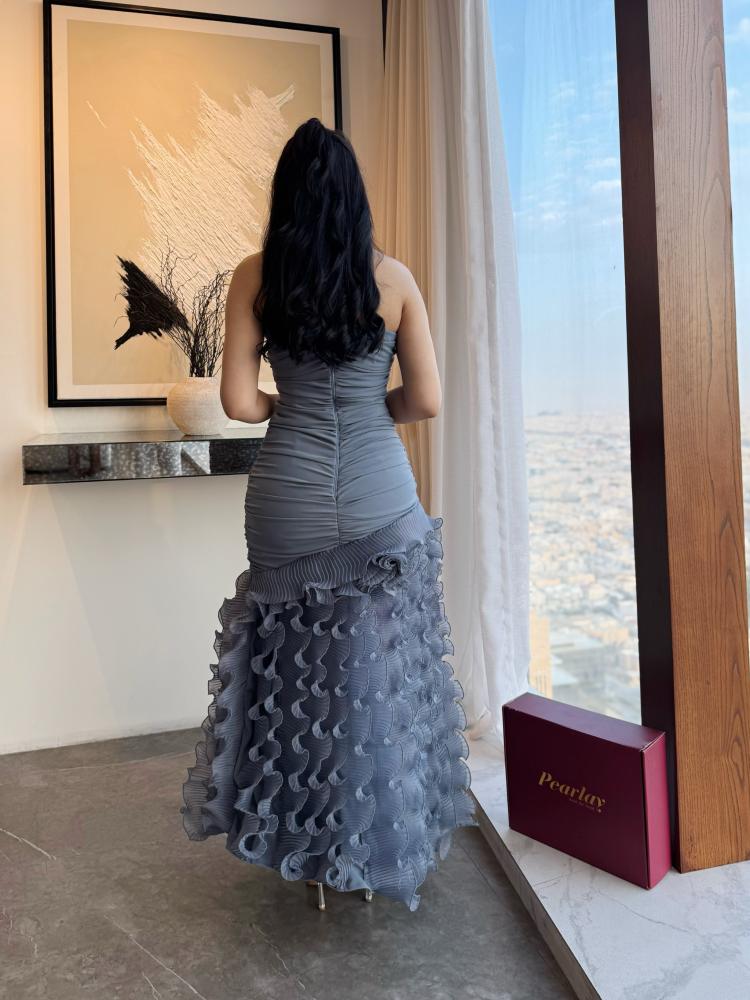• التصميم: فستان سهرة أنيق بقصة ضيقة من الأعلى تُبرز شكل الجسم تتميز بتصميم متموج ومكشكش ثلاثي الأبعاد، مما يضيف لمسة من الفخامة والحركة الديناميكية.