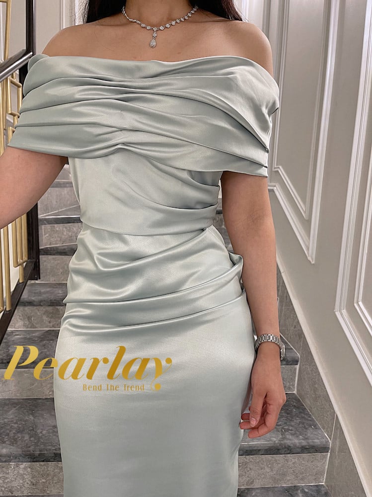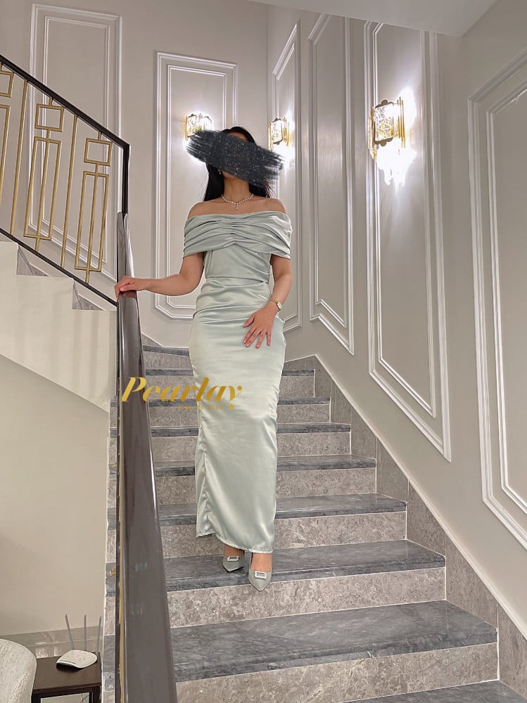 لون الفستان اخضر فاتح جداً مائل للرمادي