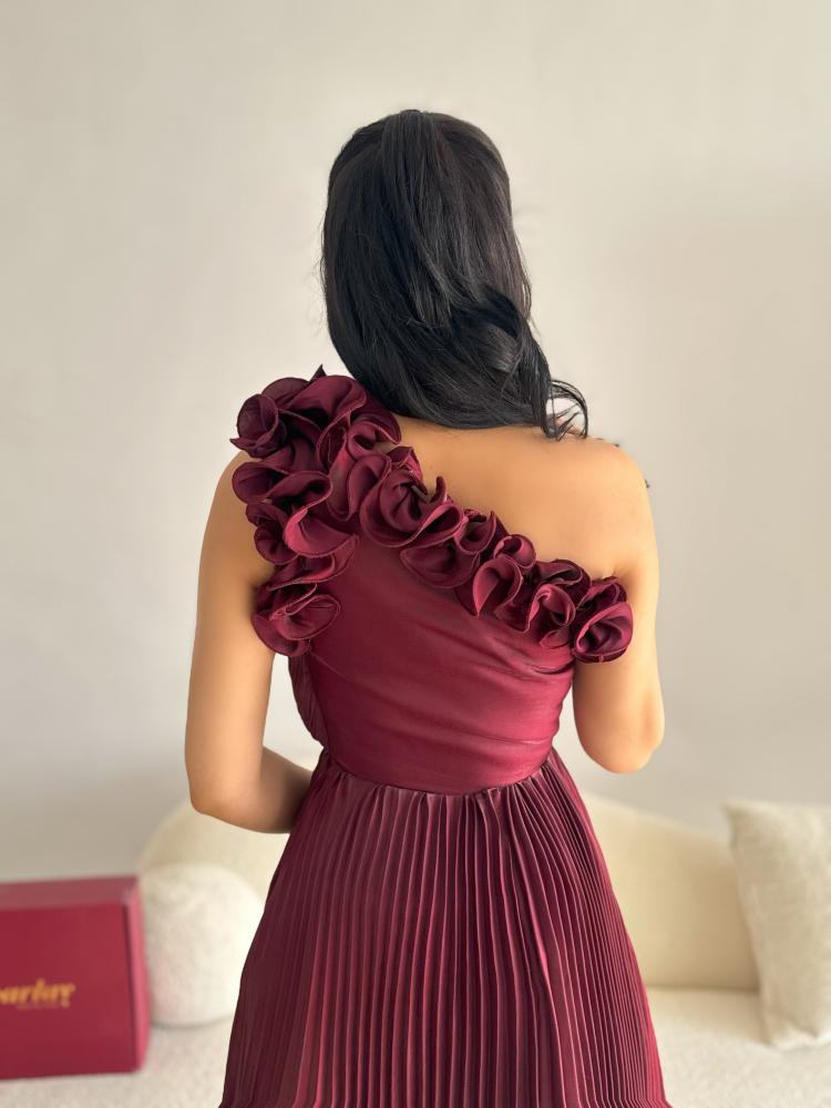 1. تصميم الكتف الواحد: يتميز الفستان بقصة فريدة على كتف واحد مزين بزهور ثلاثية الأبعاد تضيف لمسة من الرقي والجاذبية.