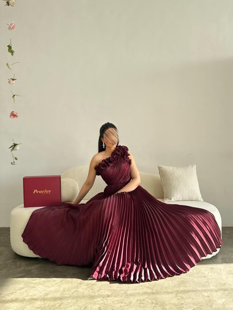 فستان أنيق ومميز بتصميم يعكس الأنوثة والفخامة، مصنوع من قماش فاخر يتميز بنعومته وجودته العالية. يأتي بلون أحمر عنابي غني يمنح مظهرًا ملكيًا، ويشمل التفاصيل التالية: