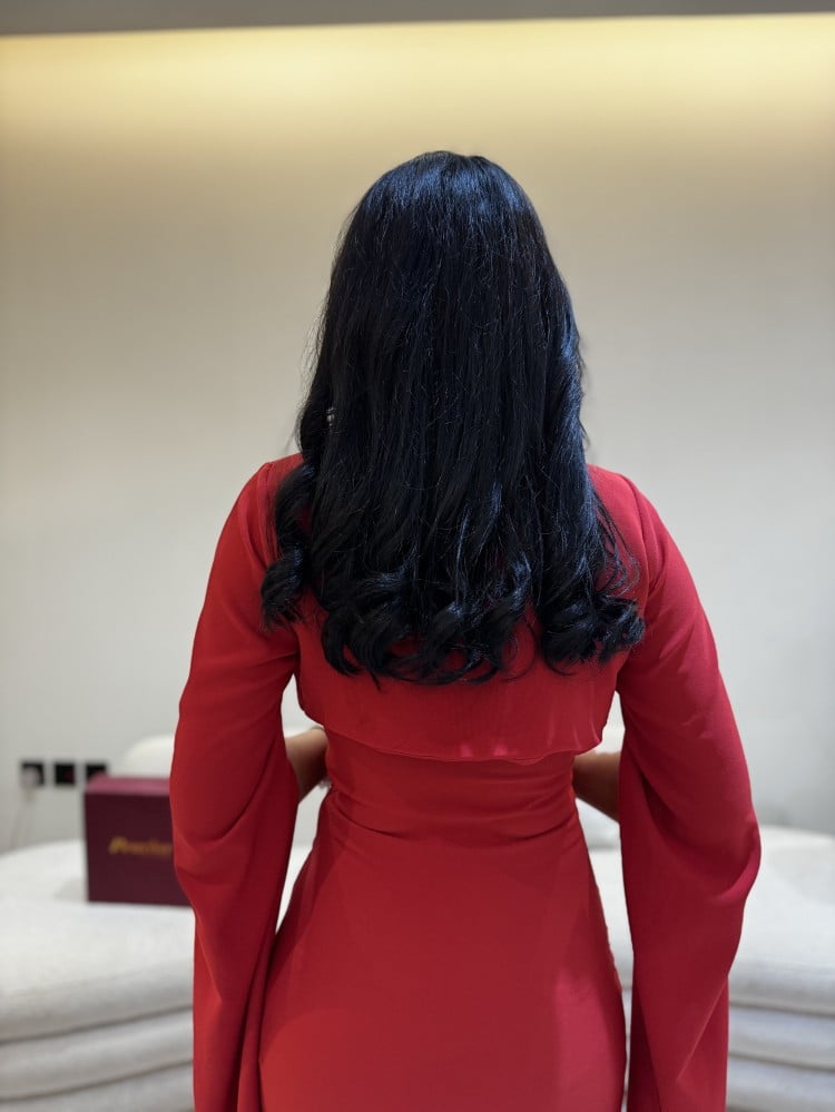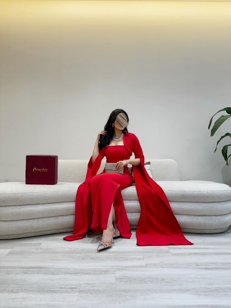فستان احمر باكمام منفصه وطويله