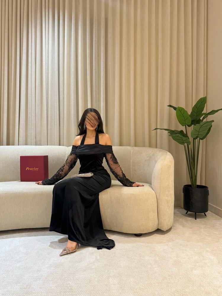 • أكمام طويلة مصنوعة من الدانتيل المزخرف بتطريز دقيق وبراق منفصله عن الفستان .